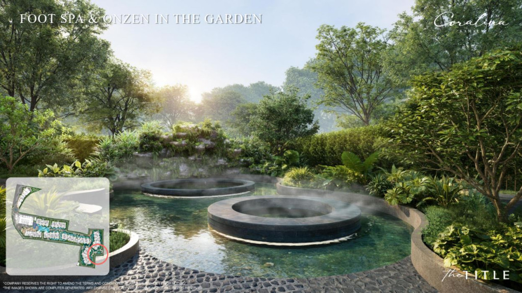 Onsen baths, foot spas, steam rooms, yoga pavilion, fitness center, games room. About 3,000 square meters of landscaped gardens with auto-irrigation. A dedicated pet-friendly building. Coworking spaces. Smart access systems and 24-hour security throughout.