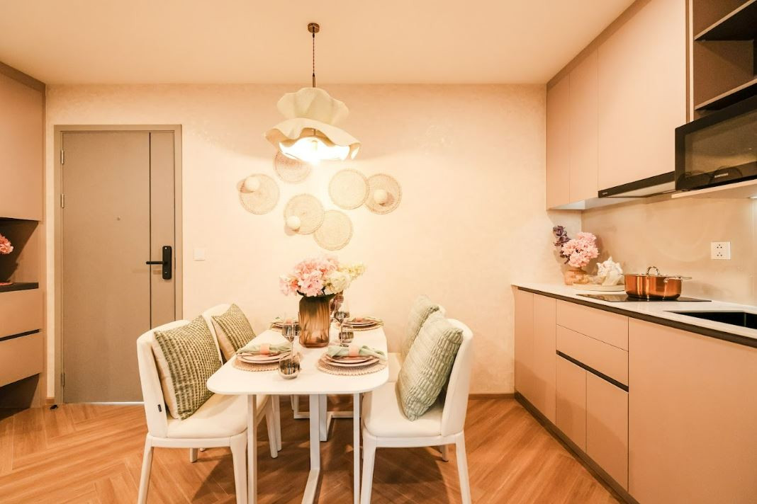 Warm, softly lit interiors combine beige tones, elegant textures, and modern furniture. Apartments are delivered fully finished, with an open living and dining area, a comfortable sofa, stylish dining set, sleek kitchen, and bedrooms featuring built-in wardrobes and refined details.