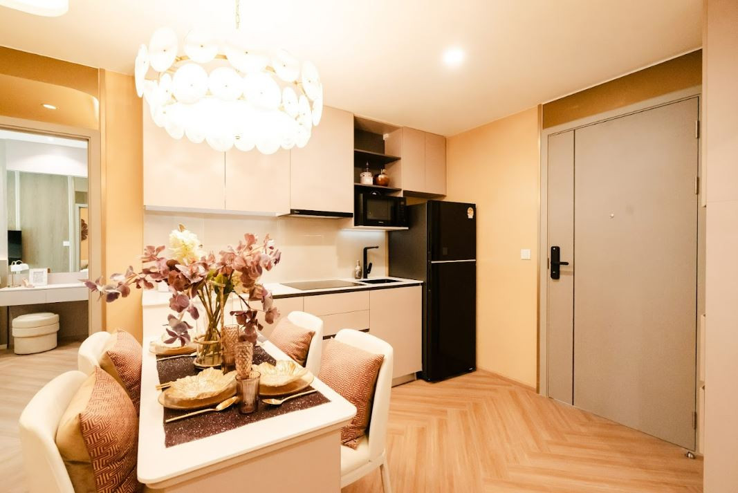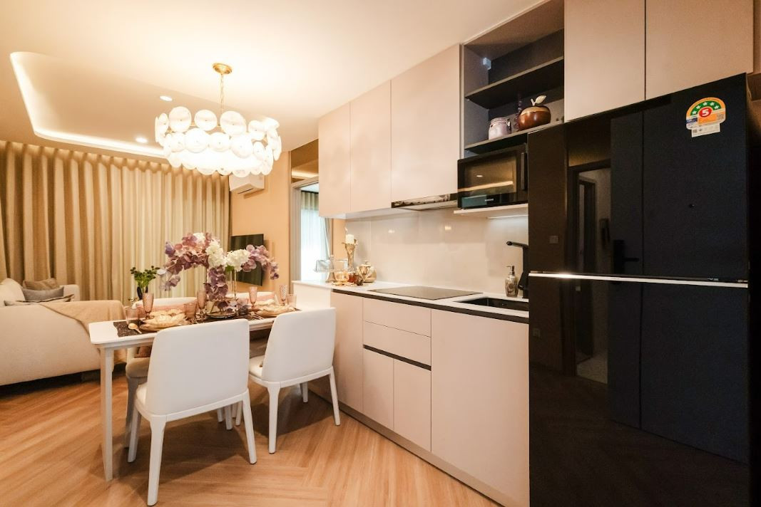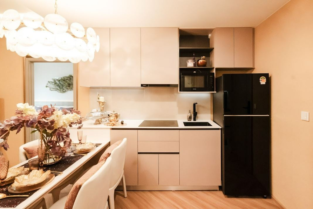 The kitchen is fitted with sleek built-in cabinetry and quality finishes, complemented by integrated appliances including a cooktop, microwave, and refrigerator. Soft ambient lighting enhances the space, while air conditioning ensures a comfortable atmosphere throughout the kitchen and living areas.
